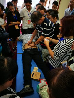 魏教授演示背部點(diǎn)揉法,基層醫生學(xué)員們將魏教授團團圍住,邊聽(tīng)邊看邊記錄,學(xué)習熱情高漲。演示模特均由學(xué)員自愿擔任,圖中女醫生當時(shí)正好左上腹疼痛,經(jīng)魏教授點(diǎn)揉、拔/走罐等治療后,疼痛立解。立竿見(jiàn)影的治療效果大大提升了醫生們的信心。